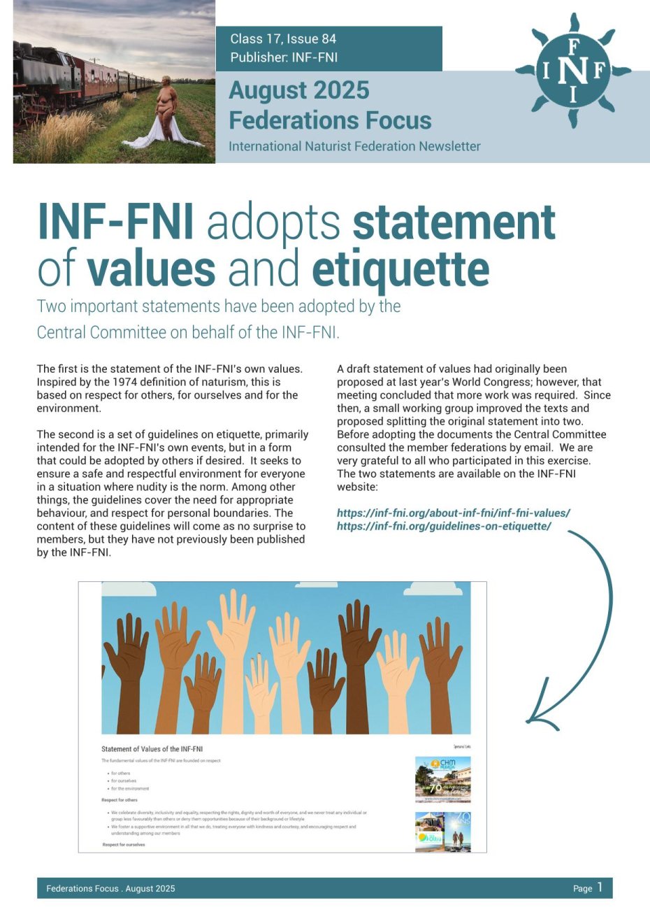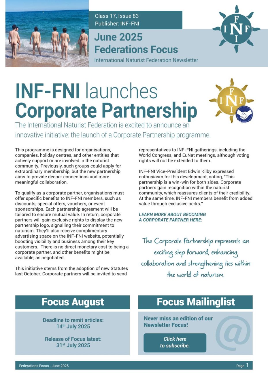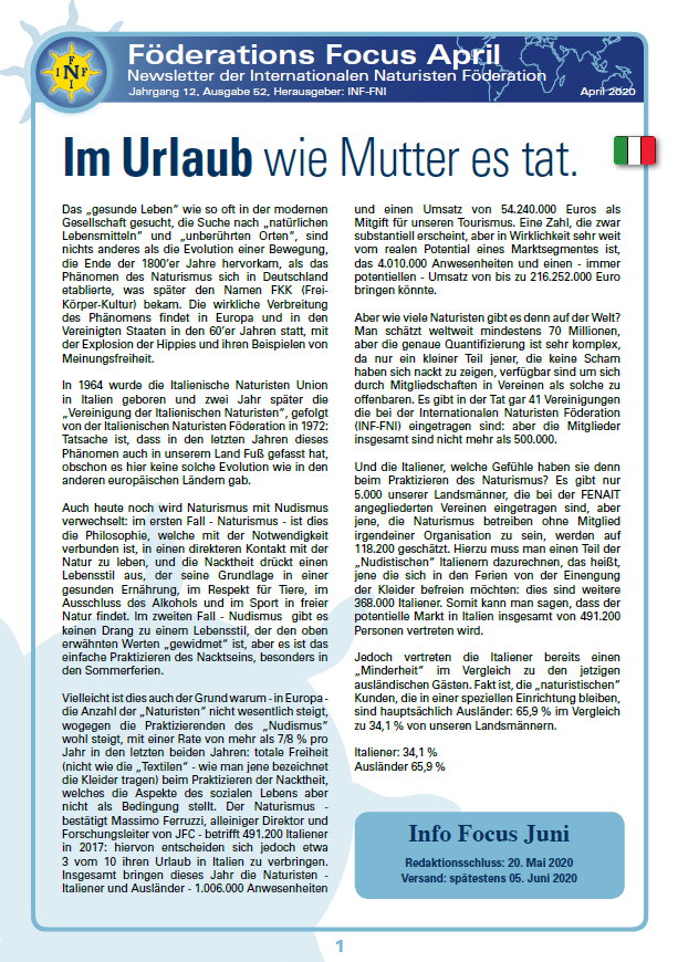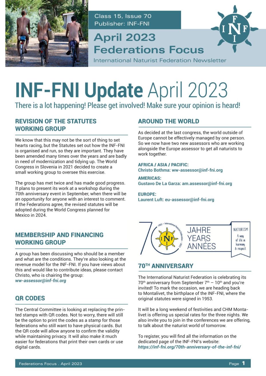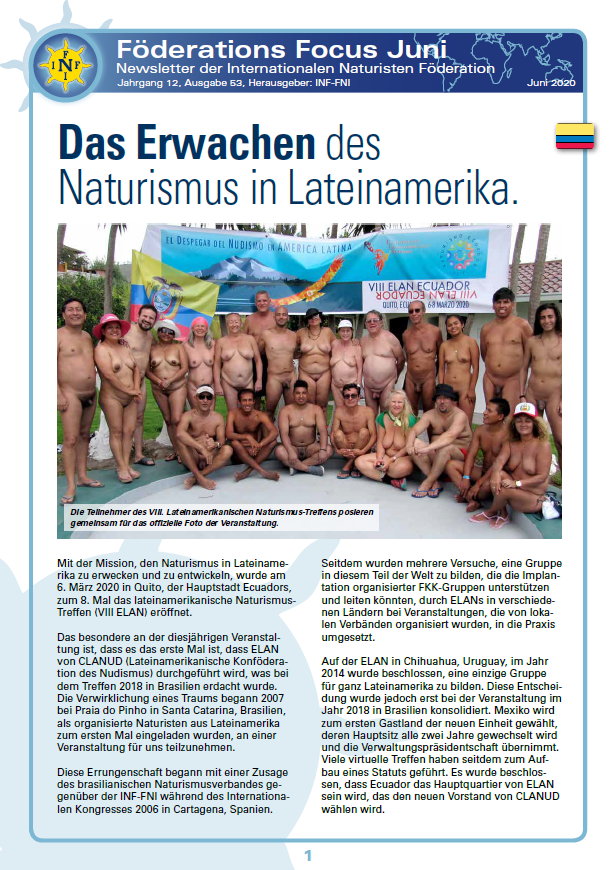 Nach dem „INF-Bulletin” und dem Magazin „naturist international” stellt die INF/FNI nun einen kostenlosen Newsletter zur Verfügung, den Ihr im Download-Bereich der INF/FNI-Webseite findet. Auch ältere Ausgaben sind dort vorhanden. Der Newsletter beinhaltet wichtige Informationen, Nachrichten und Termine. INF/FNI ➤ Downloadbereich |