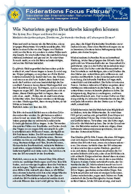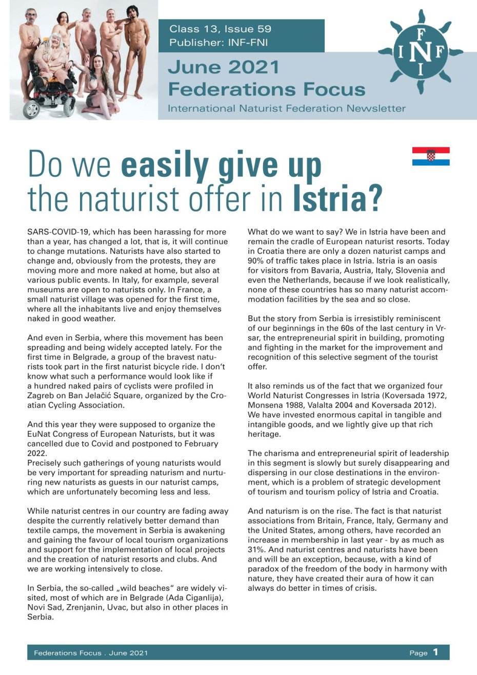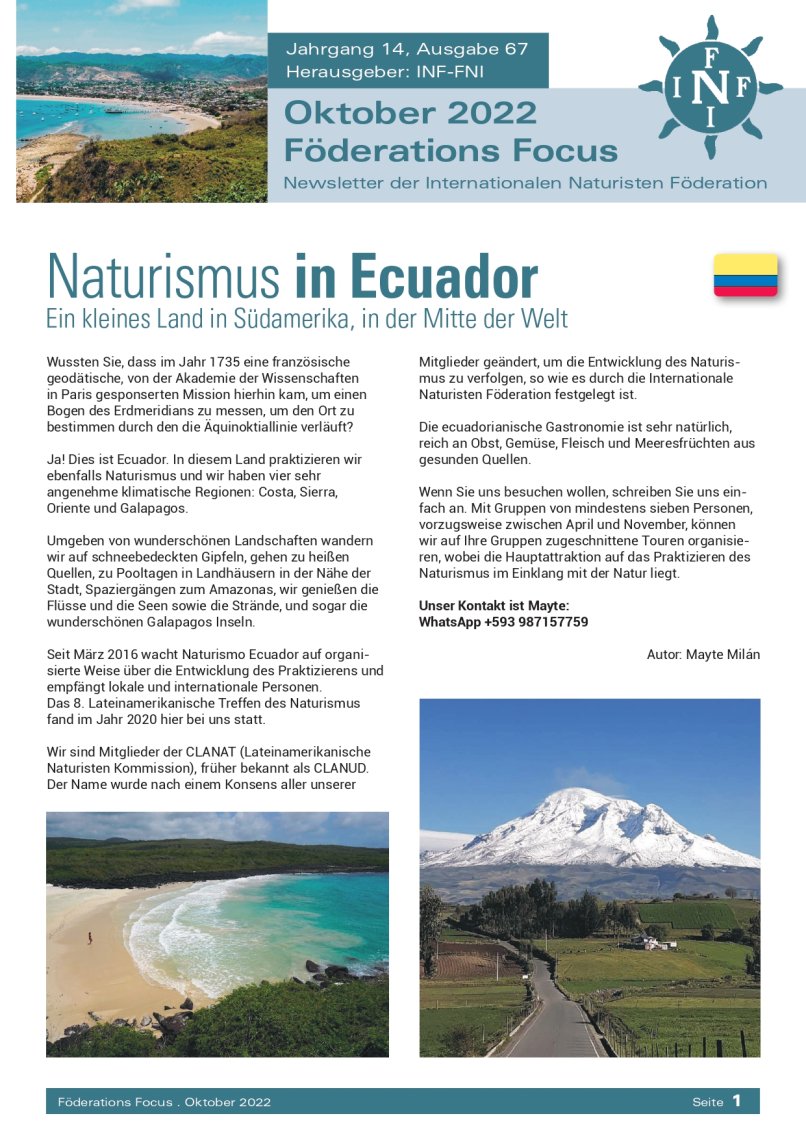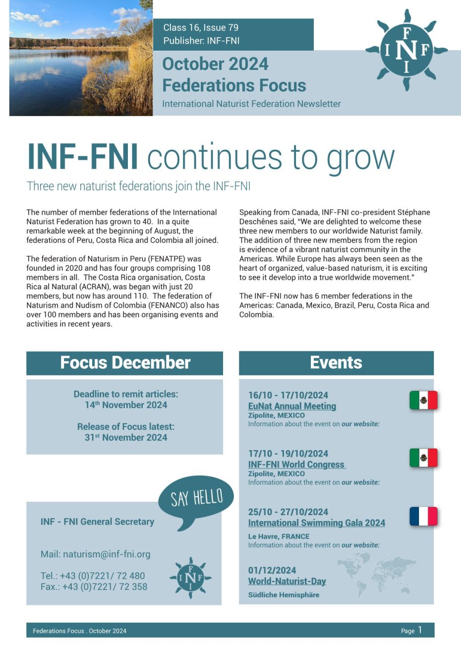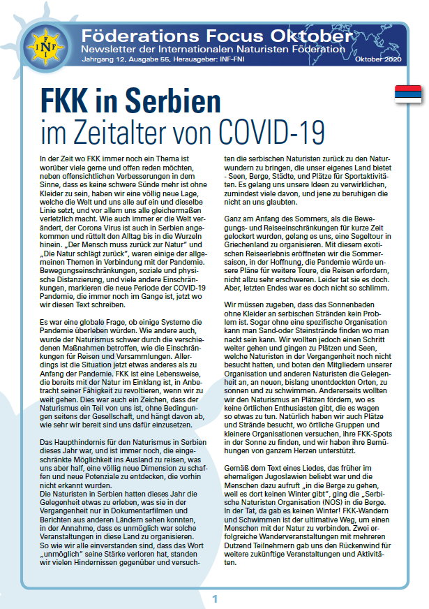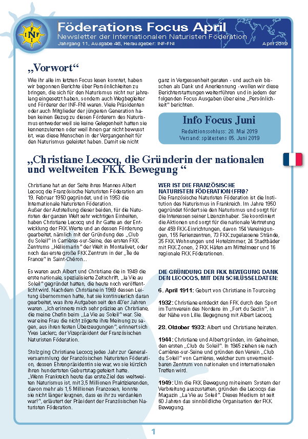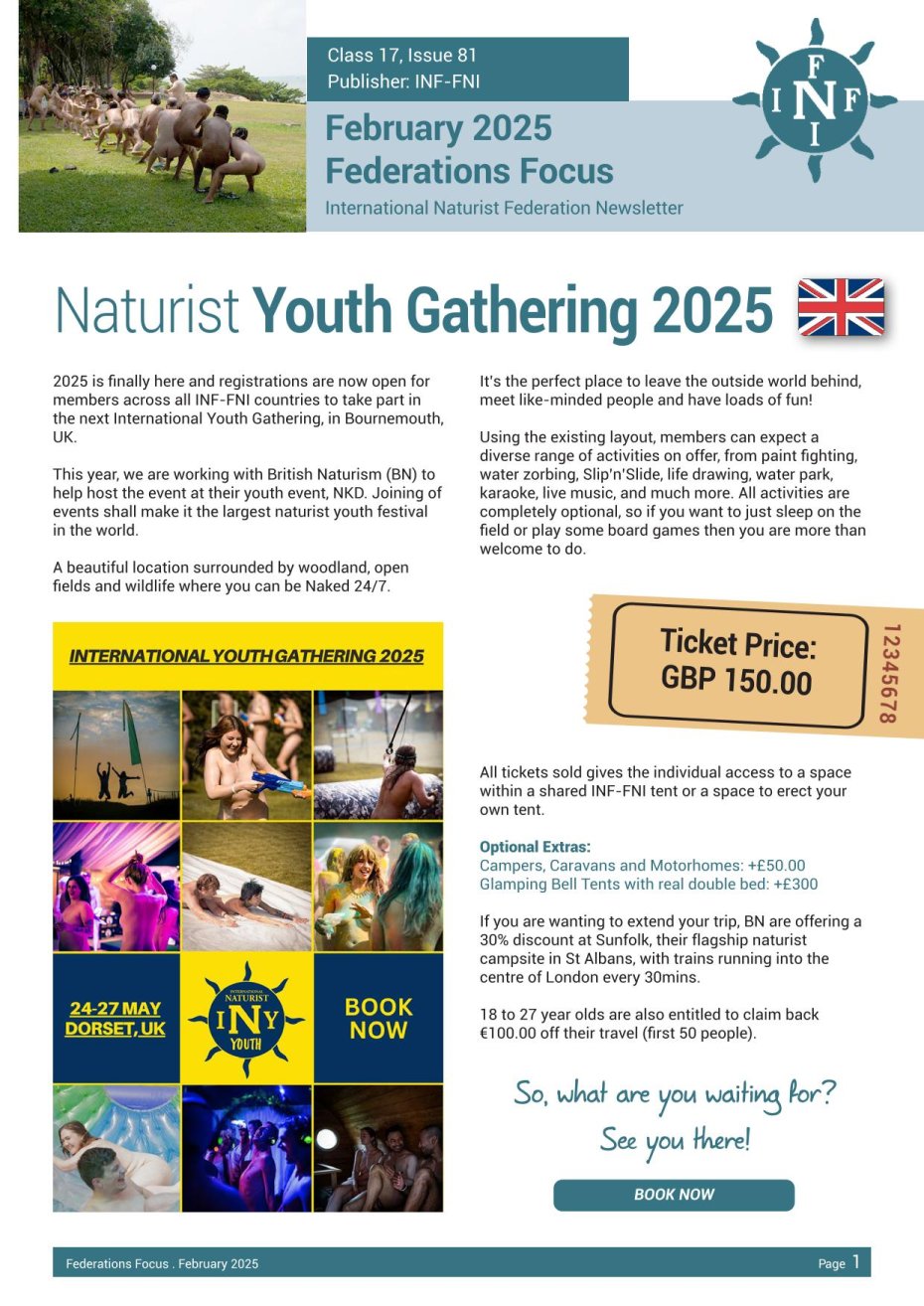 Nach dem „INF-Bulletin” und dem Magazin „naturist international” stellt die INF/FNI nun einen kostenlosen Newsletter zur Verfügung, den Ihr im Download-Bereich der INF/FNI-Webseite findet. Auch ältere Ausgaben sind dort vorhanden. Der Newsletter beinhaltet wichtige Informationen, Nachrichten und Termine. INF/FNI ➤ Downloadbereich |