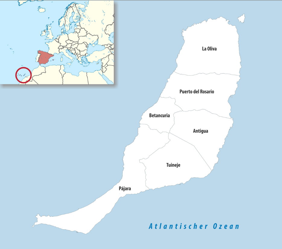 Die spanische Insel Fuerteventura zählt zu den Kanarischen Inseln im Atlantischen Ozean und befindet sich rund 120 Kilometer westlich der marokkanischen Küste. Mit einer Fläche von 1659,74 ㎢ hat sie einen Anteil von 22,15% an der Landfläche der Kanaren. Damit ist sie nach Teneriffa die zweitgrößte Insel des Archipels.