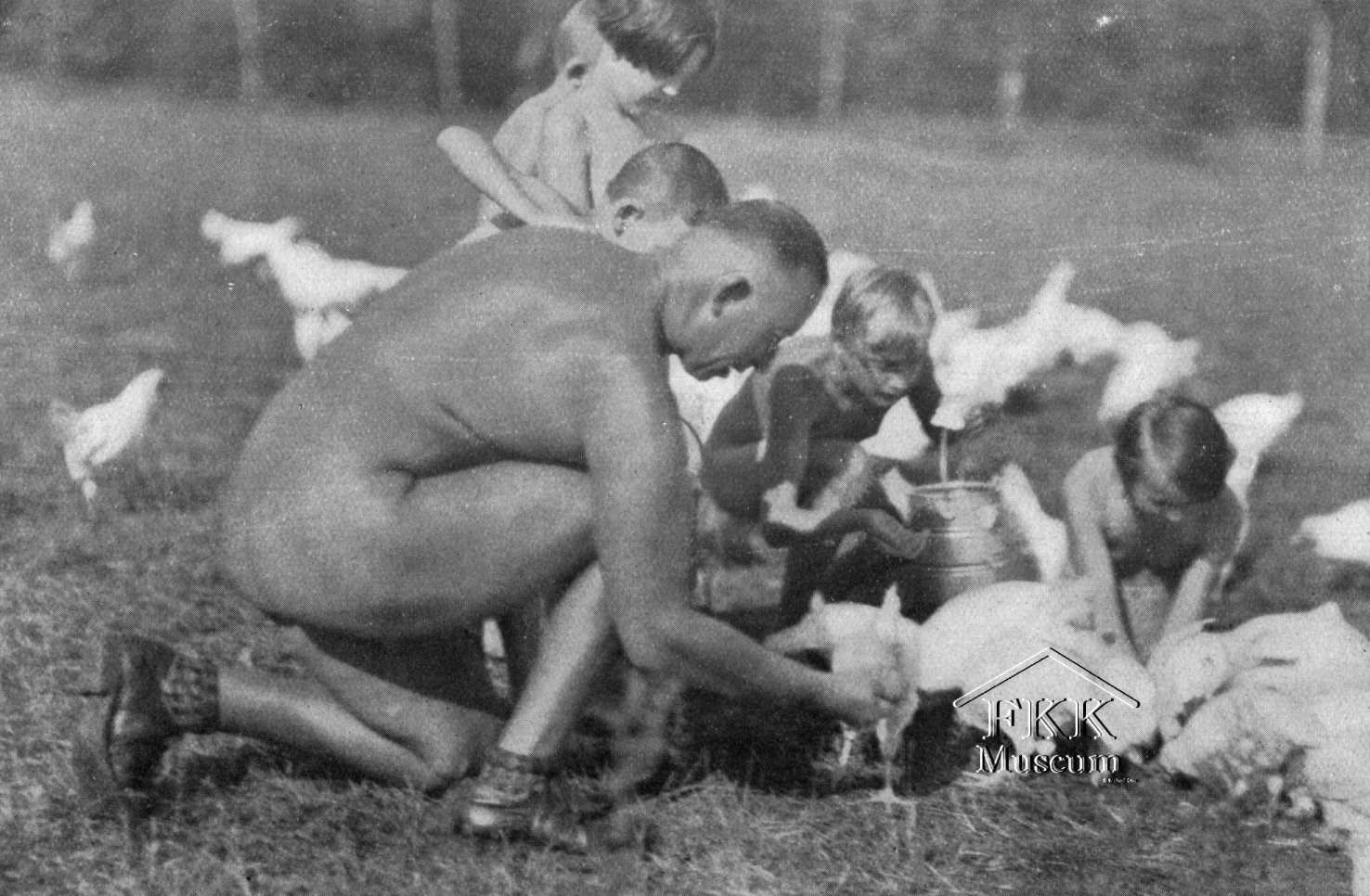Oberaufsicht hatte der „Hühnervater”, der - wie hier - ausschließlich für die Hühner verantwortlich war und diese zusammen mit den Kindern versorgte und umhegte. Die Kinder lernten dabei nicht nur den veranwortungsvollen Umgang mit Tieren, sondern auch, dass deren Leben als so genannte „Nutztiere” nur sehr begrenzt war.