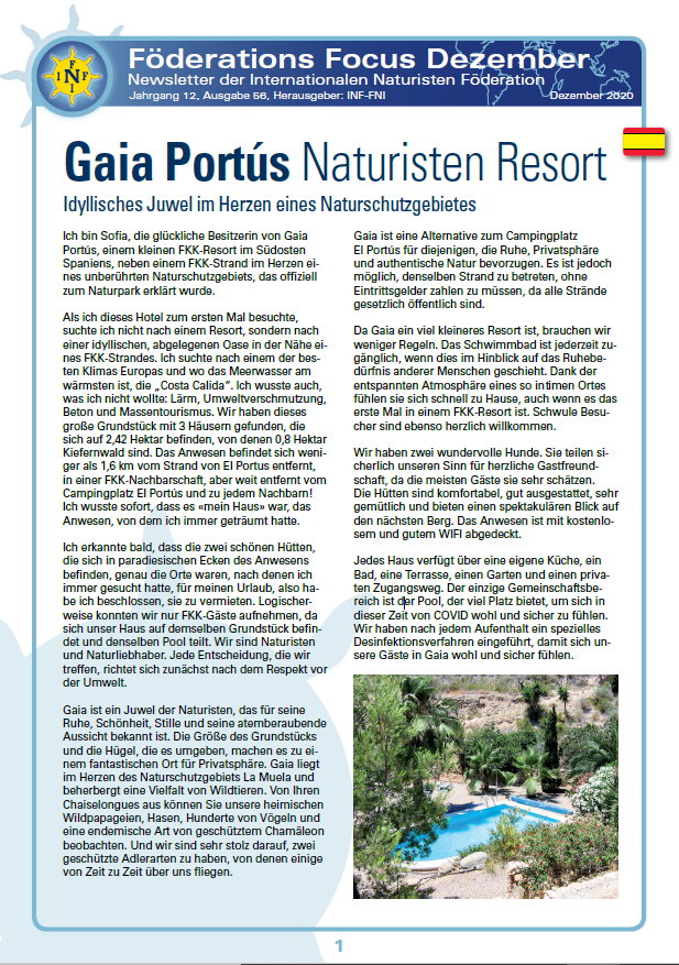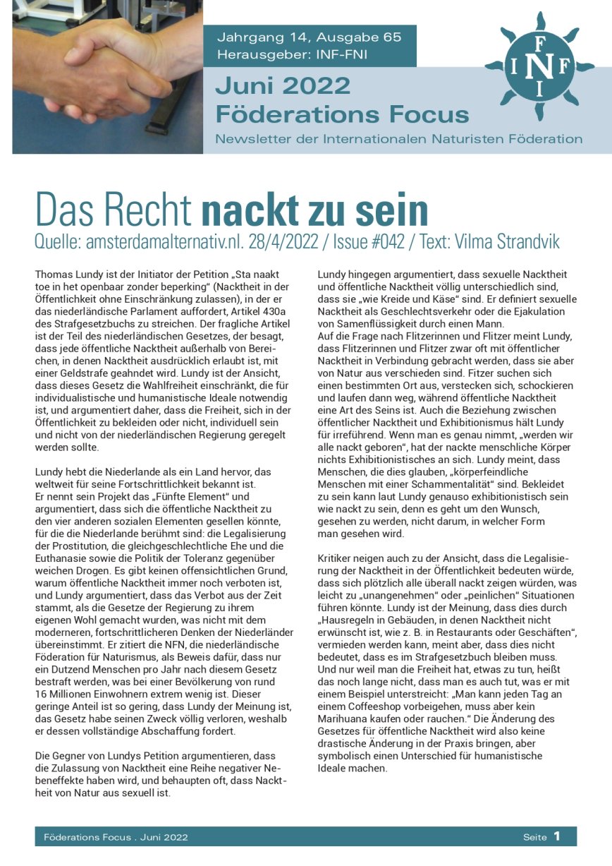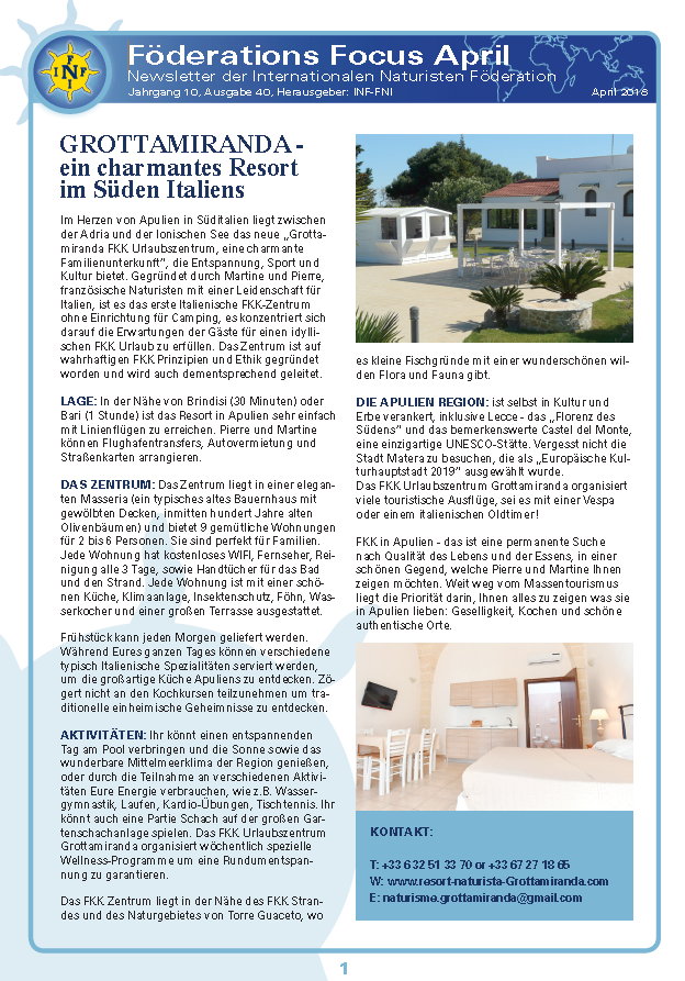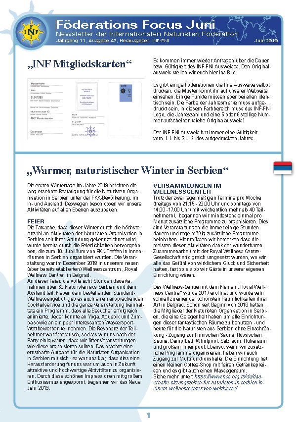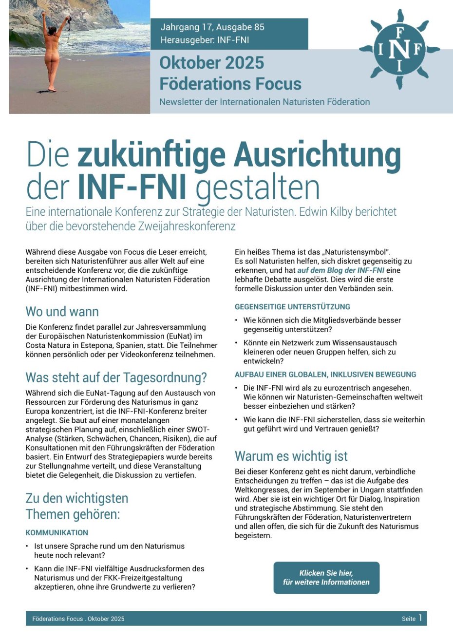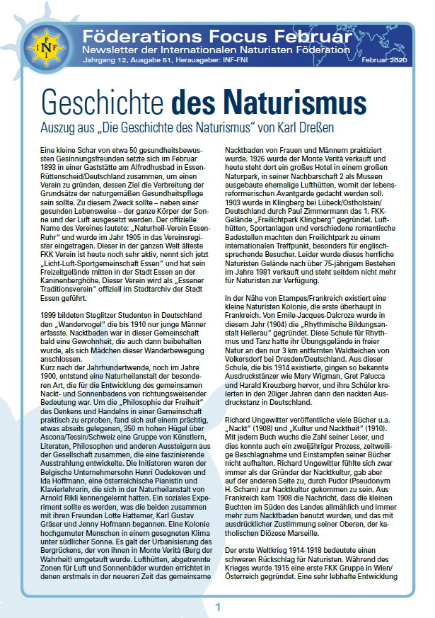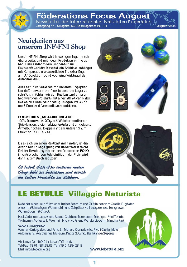 Nach dem „INF-Bulletin” und dem Magazin „naturist international” stellt die INF/FNI nun einen kostenlosen Newsletter zur Verfügung, den Ihr im Download-Bereich der INF/FNI-Webseite findet. Auch ältere Ausgaben sind dort vorhanden. Der Newsletter beinhaltet wichtige Informationen, Nachrichten und Termine. INF/FNI ➤ Downloadbereich |