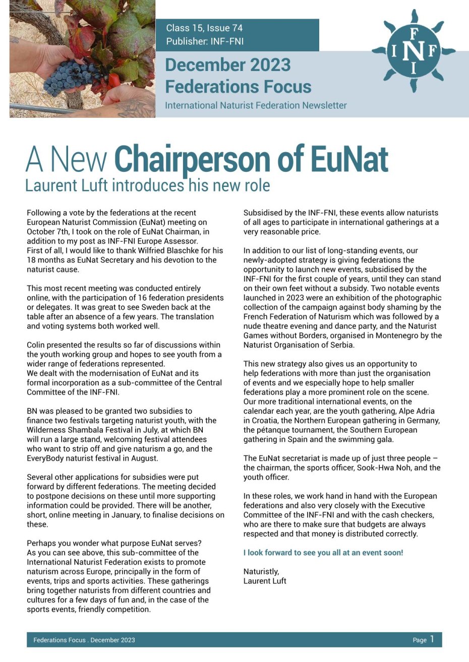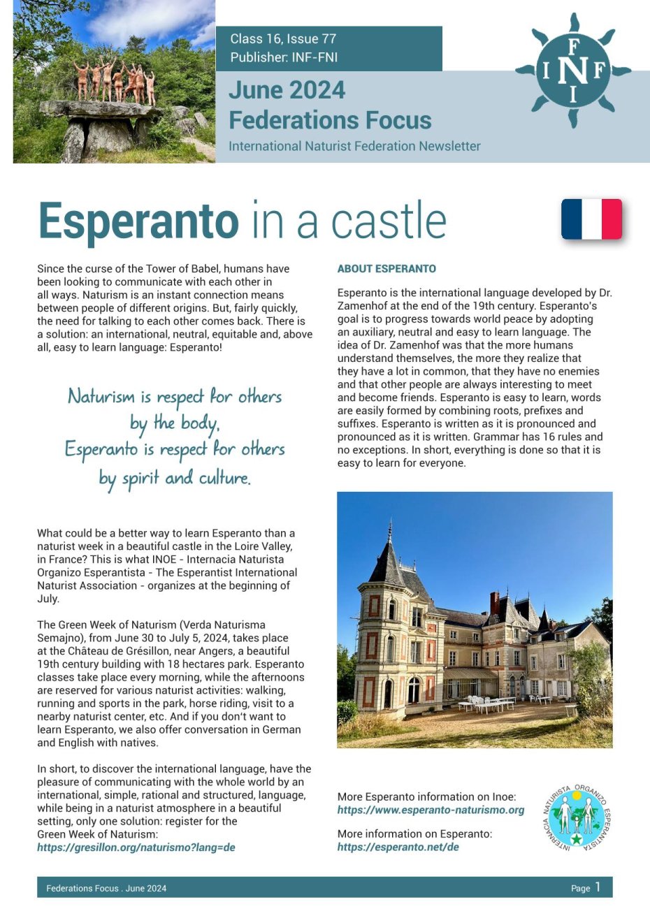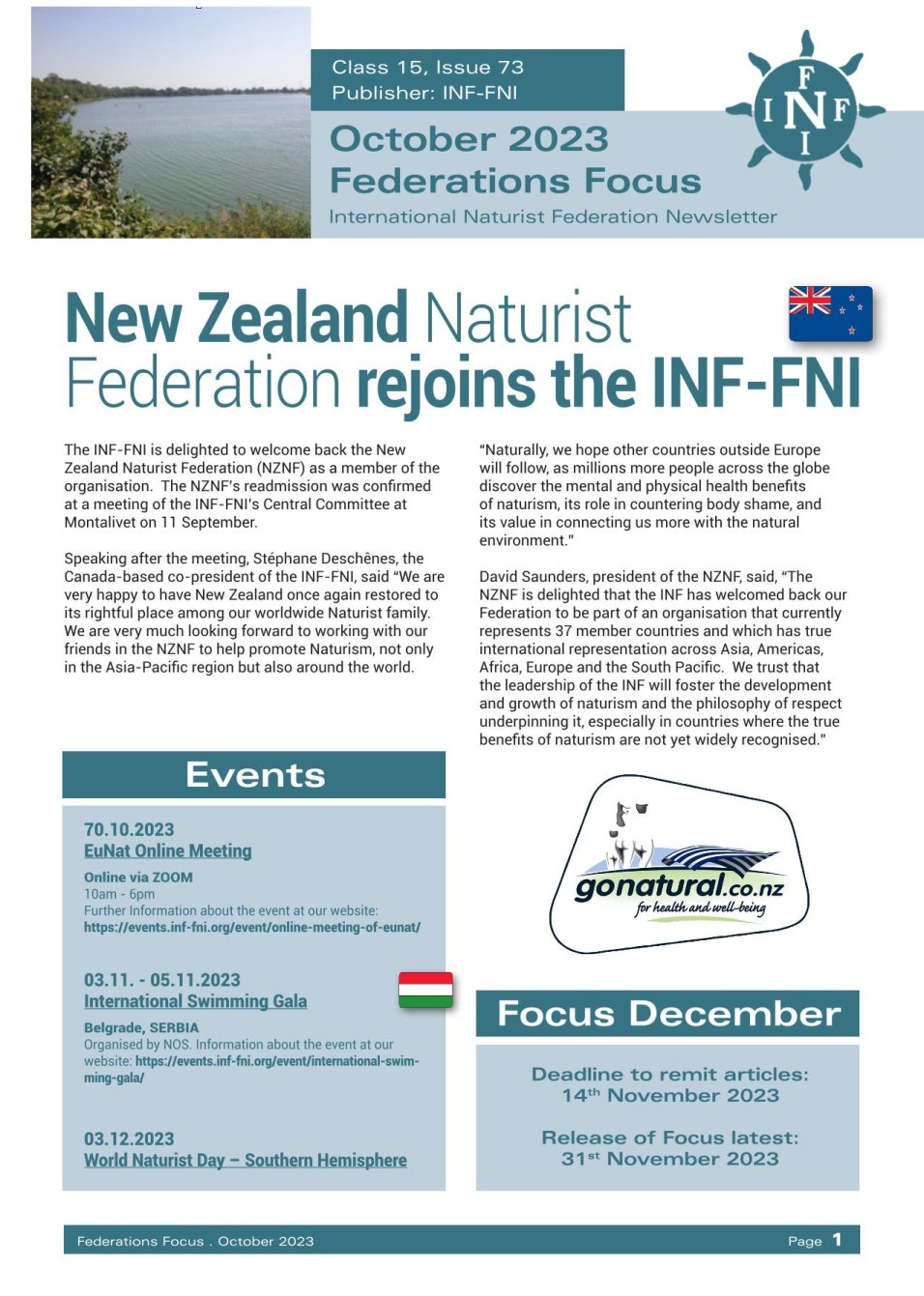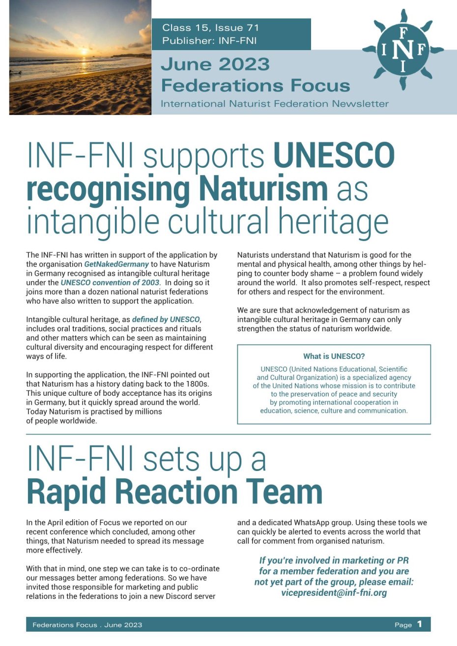 Nach dem „INF-Bulletin” und dem Magazin „naturist international” stellt die INF/FNI nun einen kostenlosen Newsletter zur Verfügung, den Ihr im Download-Bereich der INF/FNI-Webseite findet. Auch ältere Ausgaben sind dort vorhanden. Der Newsletter beinhaltet wichtige Informationen, Nachrichten und Termine. INF/FNI ➤ Downloadbereich |
