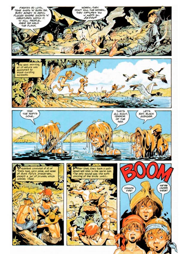 Mark Twain: Die Abenteuer von Tom Sawyer und Huckleberry Finn in einer Comic-Version, gezeichnet von Michael Ploog und Texten von Willie Schubert. Frisch und „frech” gezeichnet, eben so, wie man sich die beiden Hauptdarsteller auch vorstellt. Ein paar ihrer Streiche und Abenteuer in diesem Comic vorgestellt, frei nach Mark Twain.