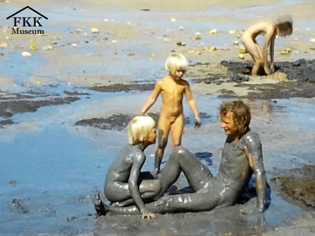 und Erhard Hagebeuker (ehemaliger Bundesvorsitzender der fkk-jugend e.V.) mit ihren Kindern bei der Körperbemalung mit Tonschlick und Sand im Centre