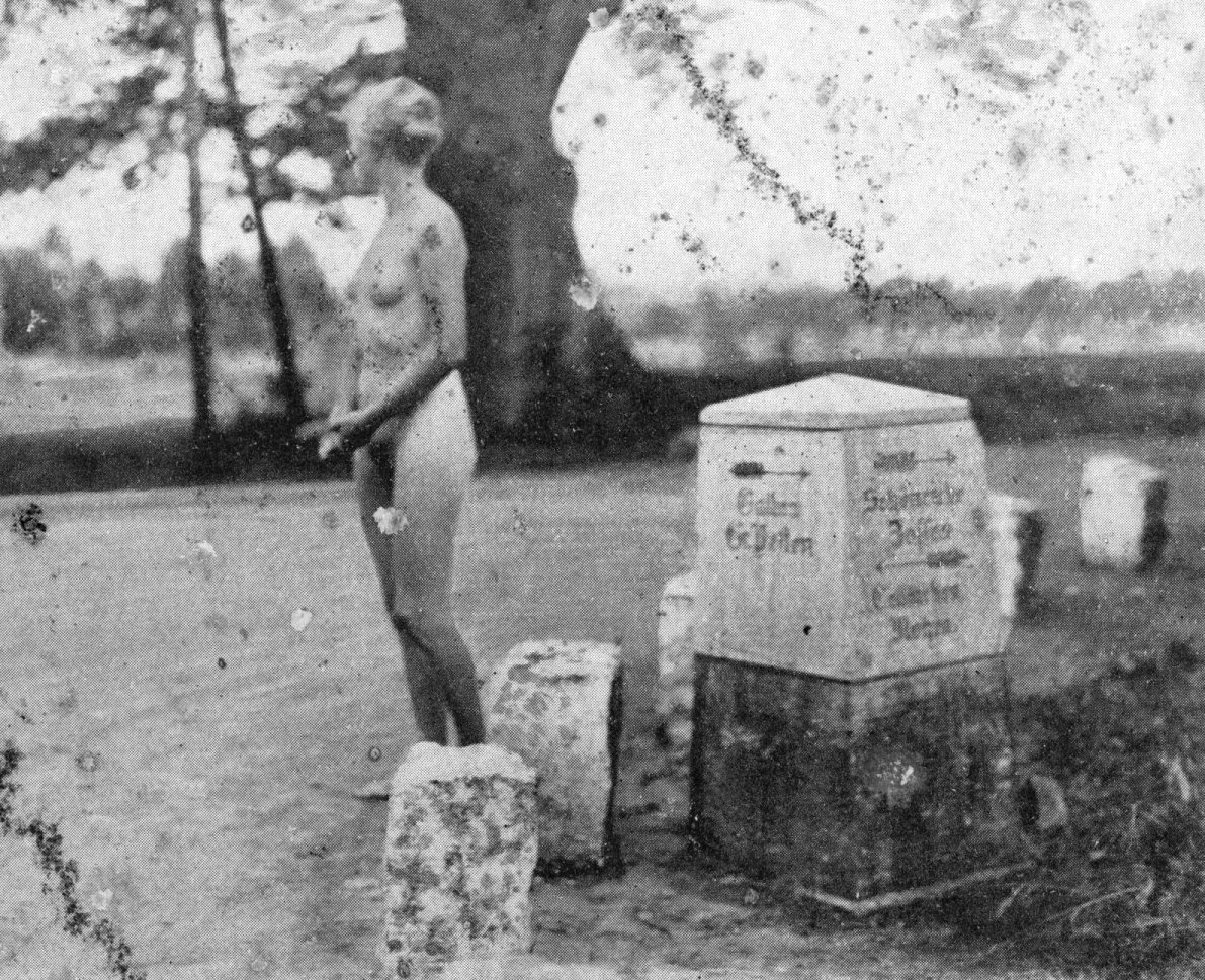 | Im Jahre 1928 fotografierte Joseph Bayer diese junge Frau in der Nähe eines Wegweisers aus Stein an einer Chaussee in Richtung Kallinchen, einem Dorf am Motzener See - gehört zur Stadt Zossen (Brandenburg). Aus der alten Chaussee ist inzwischen eine Landstraße geworden. Ob der (inzwischen restaurierte) Wegweiserstein heute noch an der exakt (!) gleichen Stelle steht, wie im Jahre 1928, ist uns leider nicht bekannt. |