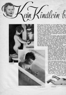 „Das Wunder der Haut” war das Hauptthema dieser Ausgabe des Reformhaus-Heftes. Erklärt wird der Aufbau der Haut und ihre Funktion als Schutz und natürlich die Pflege der Haut mit Produkten aus dem Reformhaus. Es wird erwähnt, dass es gerade für Kinder sehr gesund ist, wenn es das Wetter erlaubt, immer möglichst nackt zu sein, um so Luft und Sonne an den ganzen Körper gelangen zu lassen. In dem zweiseitigen Artikel „Kein Kindlein braucht mehr wund zu sein” (Doppelseite) werden nicht nur die entsprechenden Wundschutzmittel (Öle und Pulver) vorgestellt, es wird auch darauf hingewiesen, die Kinder möglichst oft „nackig” herum laufen zu lassen, um halt so Wundstellen vorzu- beugen, denn, wo keine Windel oder unbequeme Kleidung scheuert, da kann das Kind auch nicht wund werden. |