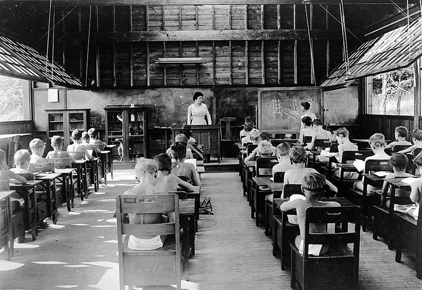 Damit die jungen Patienten in der Schule nicht zu viel Unterricht versäumten, wurden Klassenräume eingerichtet, die viel Licht und Luft einliessen. Wie auf dem Bild, welches aus den 1920er Jahren stammt, zu sehen, wurden die Kinder nicht vollständig nackt unterrichtet, sie trugen eine Art Lendenschurz. Jungen und Mädchen wurden selbstverständlich getrennt voneinander unterrichtet.