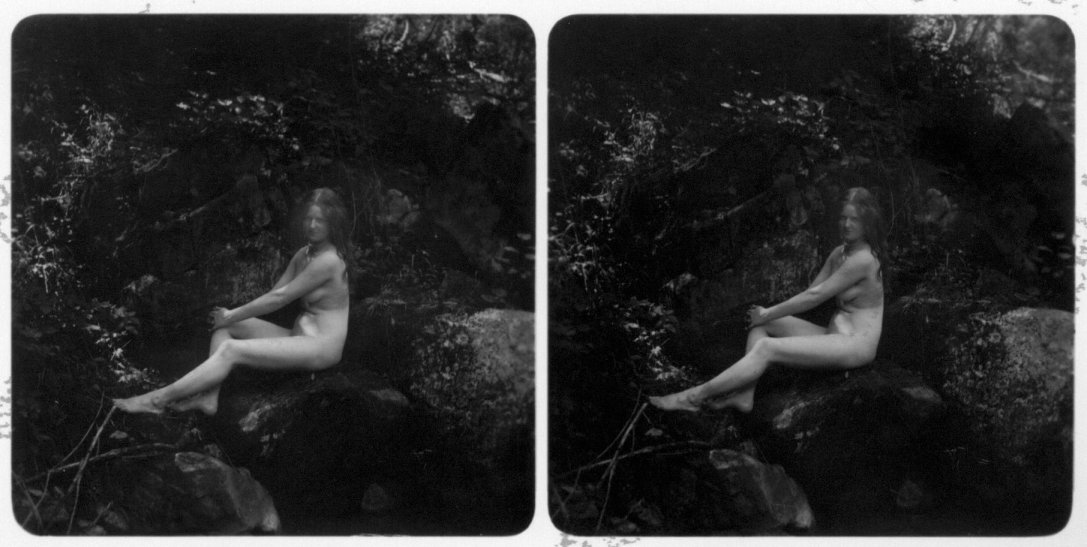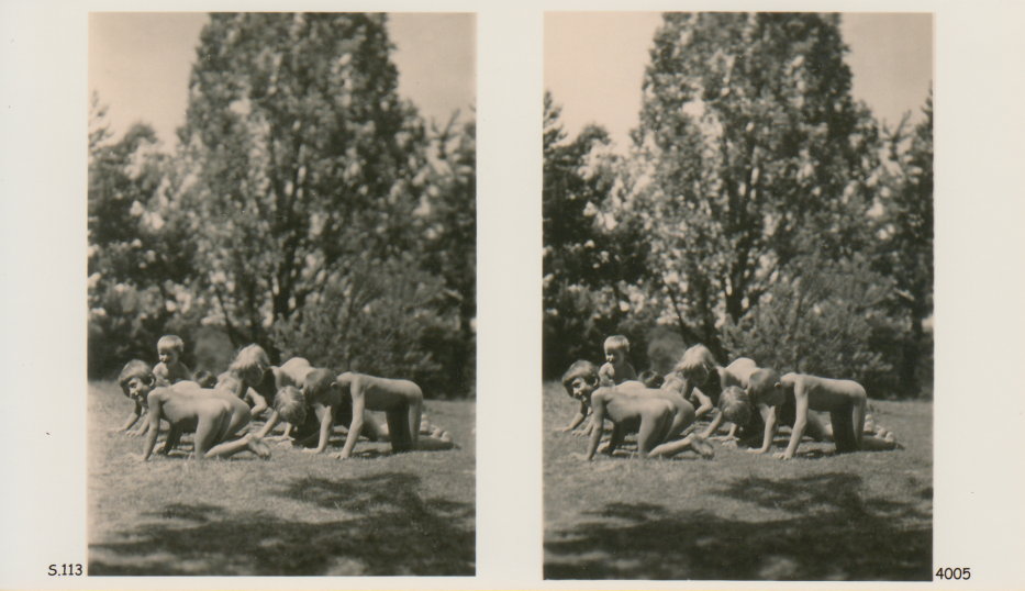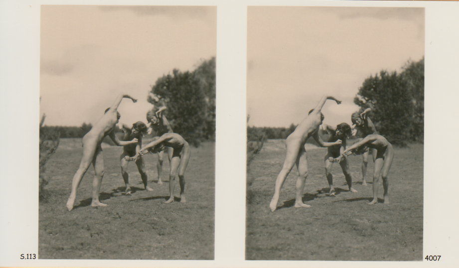 | Mittels zweier, fast identischer Bilder, lässt sich ein Motiv mit einem Stereoskop so wiedergeben, dass ein räumlicher Eindruck von Tiefe entsteht (siehe auch: Wikipedia → Stereoskopie). Eine fotografische Technik, welche auch schnell Einzug in die Fotografie der damaligen Nacktkultur fand. |