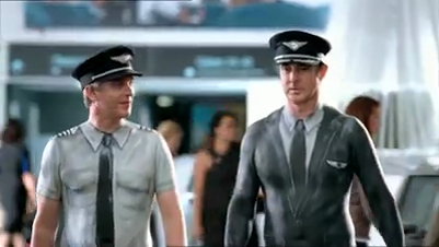 Crew und Bodenpersonal der Fluglinie sind auf dem ersten Blick angezogen ... erst, wenn man genauer hinsieht, lässt sich erkennen, dass die ganzen Uniformen nur aufgemalt, das Personal ansonsten nackt ist.