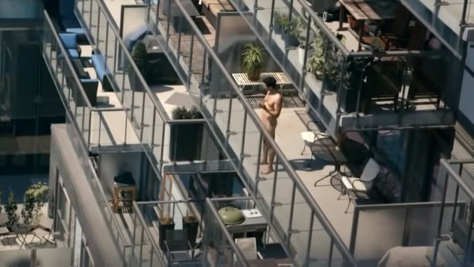 Ein Mann geht nackt auf seinen Balkon um ganz bequem von dort aus per Video-Shopping via Smartphone sich Bekleidung aus dem Gotstyle-Store zeigen zu lassen und zu bestellen.